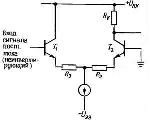 Применения дифференциальных схем в усилителях постоянного тока с однополюсным выходом. Дифференциальный усилитель может прекрасно работать как усилитель постоянного тока даже с несимметричными (односторонними) входными сигналами. Для этого нужно один из его входов заземлить, а на другой подать сигнал (рис. 2.71). Можно ли исключить «неиспользуемый» транзистор из схемы? Нет. Дифференциальная схема обеспечивает компенсацию температурного дрейфа, и, даже когда один вход заземлен, транзистор выполняет некоторые функции: при изменении температуры напряжения Uбэ изменяются на одинаковую величину, при этом не происходит никаких изменений на выходе и не нарушается балансировка схемы. Это значит, что изменение напряжения Uбэ не усиливается с коэффициентом Кдиф (его усиление определяется коэффициентом Ксинф, который можно уменьшить почти до нуля). Кроме того, взаимная компенсация напряжений Uбэ приводит к тому, что на входе не нужно учитывать падения напряжения величиной 0,6 В. Качество такого усилителя постоянного тока ухудшается только из-за несогласованности напряжений Uбэ или их температурных коэффициентов. Промышленность выпускает транзисторные пары и интегральные дифференциальные усилители с очень высокой степенью согласования (например, для стандартной согласованной монолитной пары n-p-n - транзисторов типа МАТ-01 дрейф напряжения Uбэ определяется величиной 0,15 мкВ/°С или 0,2 мкВ за месяц).
