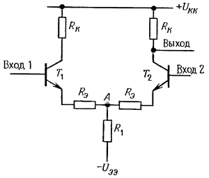 До тех пор пока оба транзистора находятся в активном режиме, потенциал точки А фиксирован. Коэффициент усиления можно определить как и в случае усилителя на одном транзисторе, если заметить, что входной сигнал оказывается дважды приложенным к переходу база-эмиттер любого транзистора: Кдиф = Rк/2(rэ + Rэ). Сопротивление резистора Rэ обычно невелико (100 Ом и меньше), а иногда этот резистор вообще отсутствует. Дифференциальное напряжение обычно усиливается в несколько сотен раз.