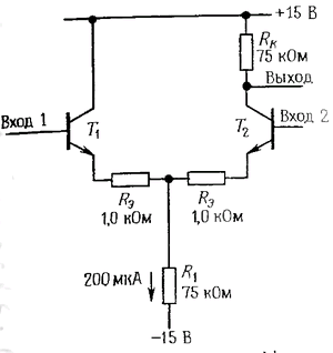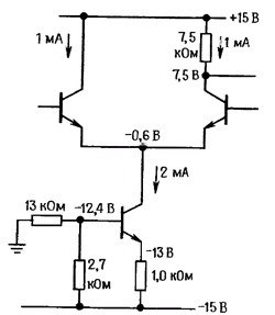 Сопротивление резистора Rк выбрано так. чтобы коллекторный ток покоя можно было взять равным 100 мкА. Как обычно, для получения максимального динамического диапазона потенциал коллектора установлен равным 0,5 Uкк. У транзистора Т1 коллекторный резистор отсутствует, так как его выходной сигнал снимается с коллектора другого транзистора. Сопротивление резистора R1выбрано таким, что суммарный ток равен 200 мкА и поровну распределен между транзисторами, когда входной (дифференциальный) сигнал равен нулю. Согласно только что выведенным формулам коэффициент усиления дифференциального сигнала равен 30, а коэффициент усиления синфазного сигнала равен 0,5. Если исключить из схемы резисторы 1.0 кОм, то коэффициент усиления дифференциального сигнала станет равен 150, но при этом уменьшится входное (дифференциальное) сопротивление с 250 до 50 кОм (если необходимо, чтобы величина этого сопротивления имела порядок мегаом, то во входном каскаде можно использовать транзисторы Дарлингтона).
