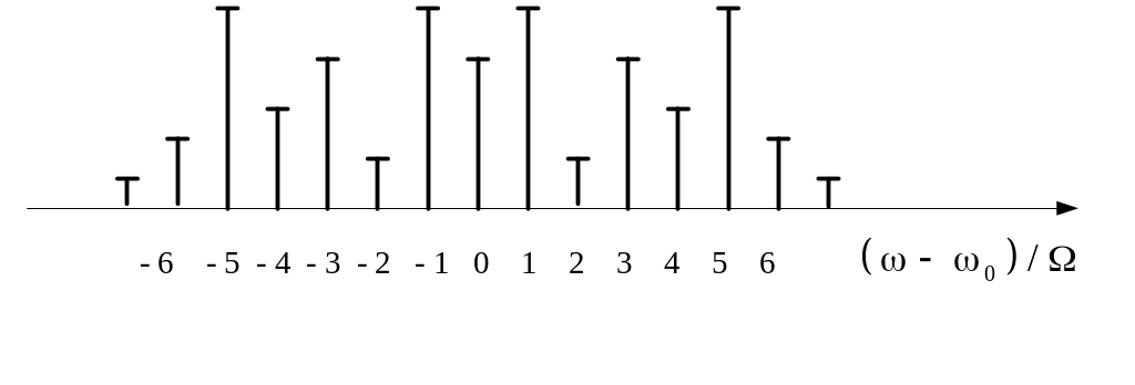 Итак, спектр ЧМ-сигнала с однотональной модуляцией при индексе модуляции т > 1 состоит из несущего колебания и двух групп высокочастотных гармоник в виде бесконечного числа боковых составляющих с частотами ω0 + nΩ и ω0 - nΩ, расположенными попарно и симметрично относительно несущей частоты ω0. Амплитуды всех составляющих спектра сигнала определяются соответствующими значениями функций Бесселя. Теоретически спектр ЧМ-сигнала (аналогично и ФМ-сигнала) бесконечен по полосе частот, однако в реальных случаях он ограничен.