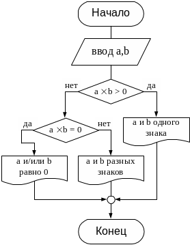 Чтобы узнать одного ли знака две переменные, достаточно их перемножить. Если результат положительный, то переменные одного знака. Поскольку в алгоритме должна быть предусмотрена реакция на все допустимые варианты исходных данных, то должна быть и проверка a и b на нулевые значения. |
