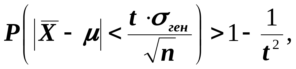 Применительно к выборочному методу из теоремы Чебышева следует, что с вероятностью, сколь угодно близкой к единице, можно утверждать, что при достаточно большом объеме выборки и ограниченной дисперсии генеральной совокупности разность между выборочной средней и генеральной средней будет сколь угодно мала и оценивается по формуле: