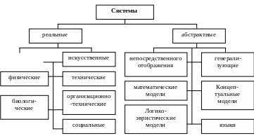 Абстрактные системы разделяют на системы непосредственного отображения (отражающие определенные аспекты реальных систем) и системы генерализирующего (обобщающего) отображения. К первым относятся математические и эвристические модели, а ко вторым – концептуальные системы (теории методологического построения) и языки.