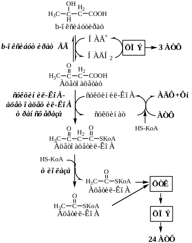 β-Гидроксибутират, попадая в клетки, дегидрируется НАД-зависимой дегидрогеназой и превращается в ацетоацетат. НАДН2 направляется ЦПЭ;
