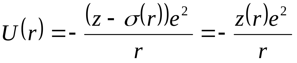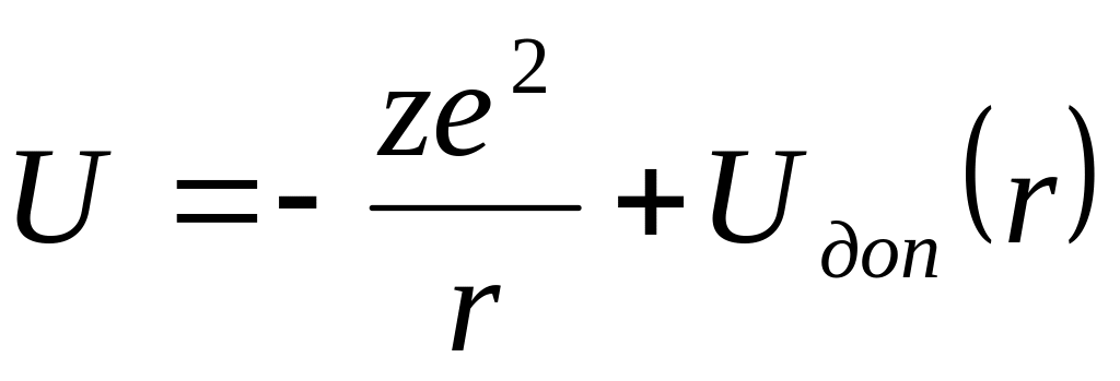 В сложном атоме, содержащем 2 и более электронов, эти электроны взаимодействуют между собой, и поэтому, нельзя считать, что каждый электрон двигается в поле ядра независимо от всех остальных. Однако приближенно действие всех остальных электронов на данный электрон можно заменить некоторым усредненным, эффективным полем, обладающем сферической симметрией и убывающем с увеличением расстояния r рассматриваемого электрона от ядра. Дополнительная потенциальная энергия электрона Uдоп в этом поле будет функцией от r, и полная потенциальная энергия электрона в поле ядра и остальных электронов запишется в виде: