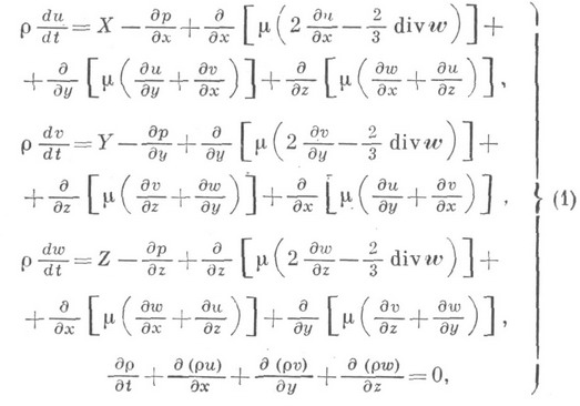 - основные уравнения движения вязкой жидкости, представляющие математическое выражение законов сохранения импульса и массы. Для неустановившегося течения сжимаемой жидкости Н.- С. у. в декартовой системе координат могут быть, записаны в виде
