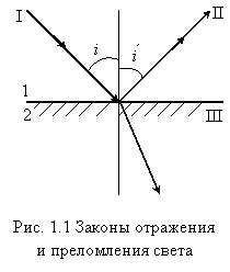 3. Закон отражения света. Падающий световой луч на границу двух сред, нормаль, проведенная к точке падения, и отраженный луч лежат в одной плоскости; угол падения равен углу отражения i = i’ (рис. 1.1).