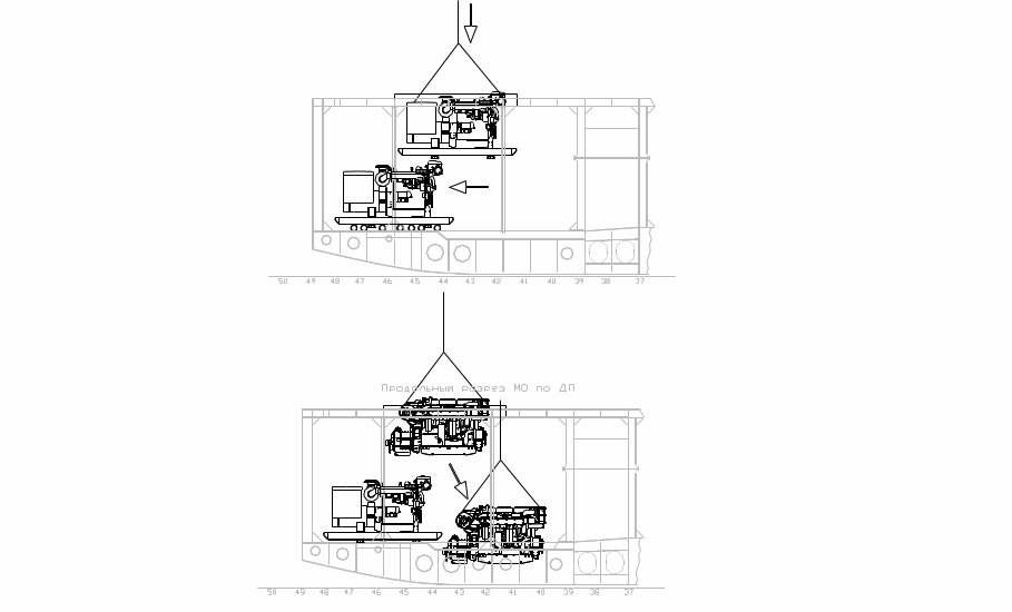 Установка производится в два этапа: 1) установка вспомогательного ДГ краном и перемещение ДГ на катках на место; 2) установка ГД краном. Спуск в МО происходит через погрузочный люк, расположенный на главной палубе (рис.14.2).