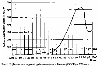 Если в 1901г. Россия занимает первое место в мире по добыче нефти (11,6 млн.т), то к 1921г. добыча упала до 3,85 млн. т. К 1926г. она превышает 7 млн.т, а к началу Великой Отечественной войны достигает 31 млн.т (для сравнения США в 1940г. добыли более 185 млн.т). К концу войны (1945) добыча нефти в СССР упала до 19,43 млн.т, а к 1951г. она возросла до 37,3 млн.т.