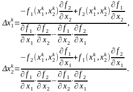 Найденные приращения используются как поправка к корню, полученному на предыдущем шаге xik, i=1,2. Подставим поправки в формулу (3.20) получим окончательно формулу Ньютона