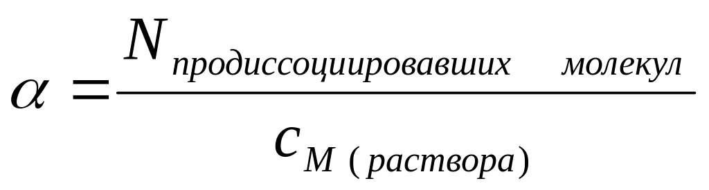 Количественно электролитическая диссоциация характеризуется степенью и константой диссоциации. Степень электролитической диссоциации (α) равна отношению числа молекул, которые продиссоциировали на ионы, к общему числу молекул электролита:
