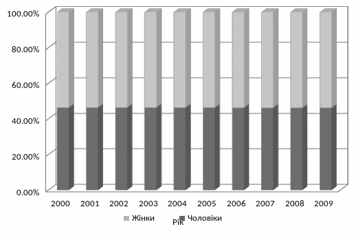 Рисунок 1.1 – Структура постійного населення України за статевою ознакою за 2000-2009 рр.