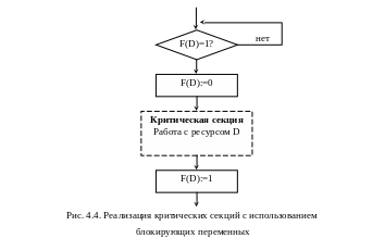 Другим способом является использование блокирующих переменных. В этом случае с каждым разделяемым ресурсом связывается двоичная переменная, которая принимает значение 1, если ресурс свободен, и значение 0, если ресурс занят. На рис. 4.4 показан фрагмент алгоритма процесса, использующего для реализации взаимного исключения доступа к разделяемому ресурсу D блокирующую переменную F(D). Перед входом в критическую секцию процесс проверяет, свободен ли ресурс D. Если он занят, то проверка циклически повторяется, если свободен, то значение переменной F(D) устанавливается в 0, и процесс входит в критическую секцию. После того, как процесс выполнит все действия с разделяемым ресурсом D, значение переменной F(D) снова устанавливается равным 1.