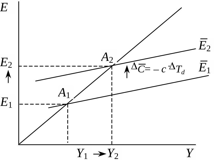 Рис. 9.3. Зменшення чистих податків у кейнсіанському хресті