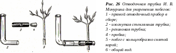 И. В. Мичуриным был разработан и удачно применялся способ укоренения в отводочных трубках (рис. 26). Этот способ состоит в следующем. На одно-двулетнем побеге, предназначенном для отводки, кольцом шириной 5—8 мм снимают кору. На обнаженную древесину надевают трубку, обвязывают для плотного прилегания нитками и замазывают садовым варом. В свободный конец трубки наливают кипяченой воды, по мере убыли ее доливают.