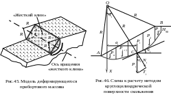 Наиболее распространенным методом расчета устойчивости откосов является метод круглоцилиндрической поверхности, который применим при отсутствии в откосе ослабленных поверхностей. Круглоцилиндрическая поверхность скольжения позволяет рассматривать ограниченный ею массив как недеформируемый «жесткий клин». При таких условиях ожидаемое смещение массива рассматривается как вращение «жесткого клина» вокруг оси, параллельной откосу и служащей осью кругового цилиндра, поверхность которого является поверхностью скольжения (рис.45).