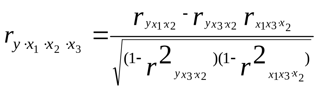 Для уравнения регрессии с тремя факторами частные коэффициенты корреляции второго порядка определяются на основе частных коэффициентов корреляции первого порядка. Так, по уравнению