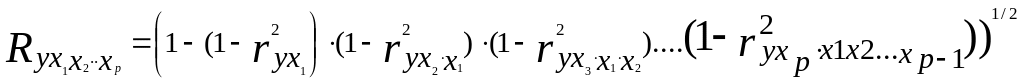 Из приведенных ранее формул частных коэффициентов корреляции видна связь этих показателей с совокупным коэффициентом корреляции. Зная частные коэффициенты корреляции (последовательно первого, второго и более высокого порядка ), можно определить совокупный коэффициент корреляции по формуле