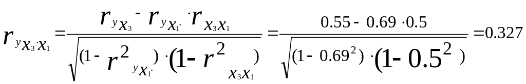 Т.е. корреляция фактора x3 с y снизилась при фиксированном влиянии на у фактора x1 (0,55 и 0,327);