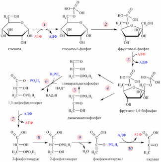 Регуляция гликолиза осуществляется через несколько ключевых этапов. Реакции, катализируемые гексокиназой (1), фосфофруктокиназой (3) и пируваткиназой (10) отличаются существенным уменьшением свободной энергии и являются практически необратимыми, что позволяет им быть эффективными точками регуляции гликолиза.