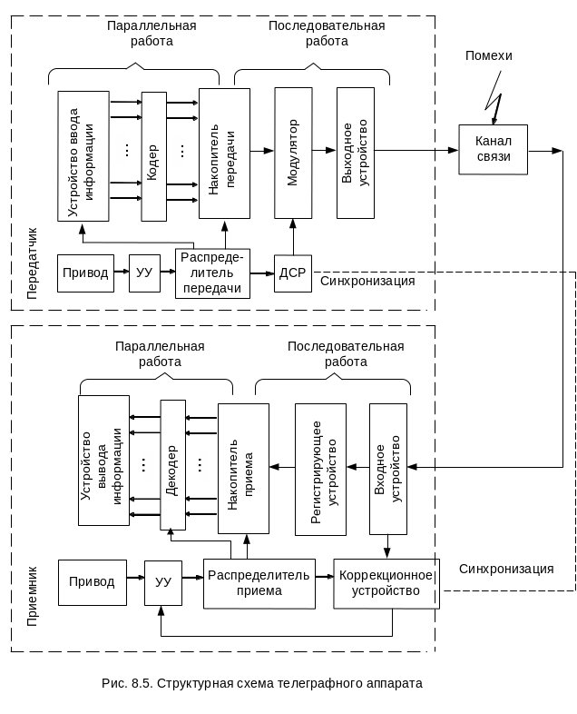 Выполнение отдельных функций передающей и приемной частями любого оконечного устройства, в том числе и телеграфного аппарата, можно рассмотреть на примере обобщенных структурных схем при взаимодействии их между собой через канал связи (рис. 8.5).