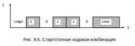 По окончании передачи в линию посылается стоповый (токовый) импульс. Пример стартстопной кодовой комбинации приведен на рис. 8.6.