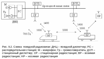 Связь ДСПмашинист осуществляется по радиоканалу, образованному с помощью стационарных радиостанций (СР), установленных на промежуточных станциях, и возимых (локомотивных) радиостанций (ВР), которыми оборудованы локомотивы.