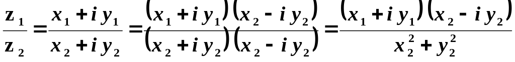 Ділення комплексних чисел виконується шляхом домноження числівника та знаменника дробу на число, спряжене до знаменника: