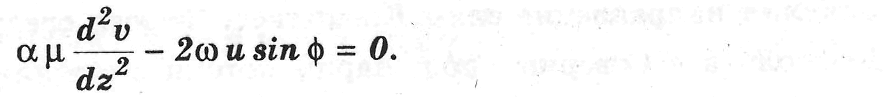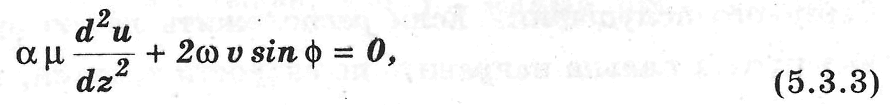 Представим себе, что над безграничной поверхностью очень глубокого однородного по плотности океана дует длительное время равномерный ветер. Течение, вызванное им, установилось. Однородность ветра по горизонтали, огромные пространства исключают возможность появления наклона уровня океана и возникновения вертикальных составляющих скорости движения воды, а большая глубина исключает влияние дна на характер движения. В этом случае система уравнений (5.3.1) примет вид: