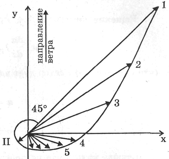 Рис. 5.3.1. Изменения скорости и направления дрейфового течения с глубиной. Стрелки — проекции скорости течения на горизонтальую плоскость. Точку I соответствует поверхности воды, точка II — глубине D.