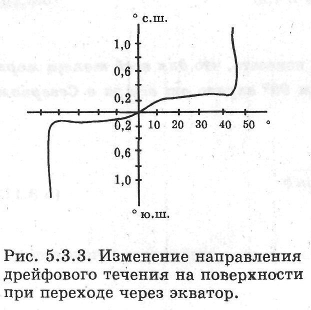 А связано это с тем, что, как показывает формула (5.3.8), глубина трения D зависит и от широты. При подходе к экватору D стремится к бесконечности. На рис. 5.3.3 изображен ход изменения отклонения вектора поверхностной скорости дрейфового течения при переходе через экватор с учетом влияния глубины.