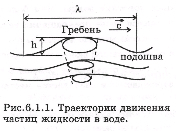 Траектории движения частиц жидкости в волне представляют собой эллипсы, быстро уменьшающиеся с глубиной. На глубине, равной половине длины волны, амплитуда периодических движений жидкости в 23 раза меньше, чем на поверхности, а на глубине, равной длине волны, они практически полностью затухают, будучи в 535 раз меньше волновых колебаний на поверхности.