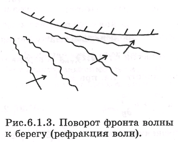 Вблизи от берега наблюдается также еще одна особенность волнения. Откуда бы ни дул ветер со стороны моря, как бы ни двигались вызванные им волны вдалеке от берега, при подходе к берегу они постепенно поворачивают и движутся к нему фронтом. Это явление происходит вследствие влияния трения о дно на скорость волны. В результате этого с уменьшением глубины скорость волны падает, что и вызывает рефракцию волн.