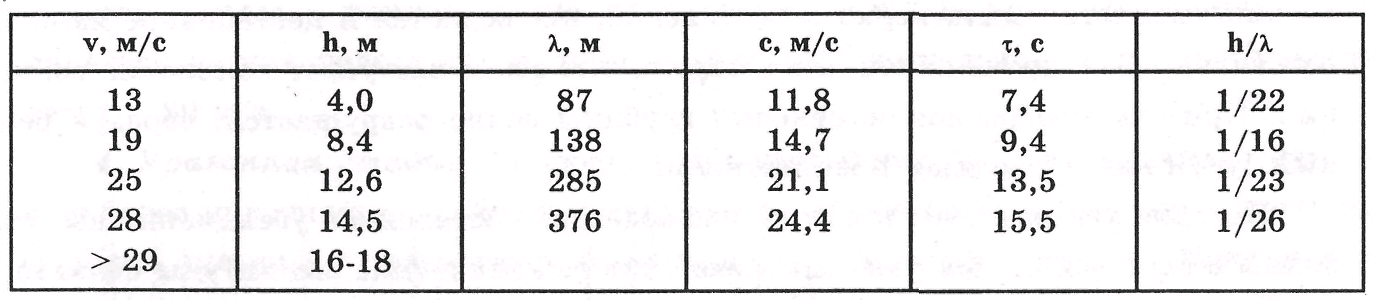Характеристики волн изменяются в зависимости от скорости ветра в довольно широких пределах, при этом обнаруживаются две общие закономерности: чем выше штормовая волна, тем она положе, т. е. при этом h/λ уменьшается; чем длиннее волна, тем больше скорость ее распространения.