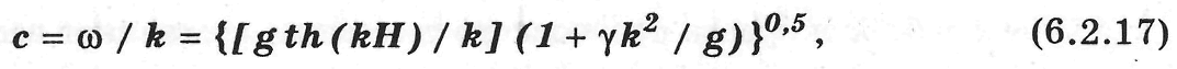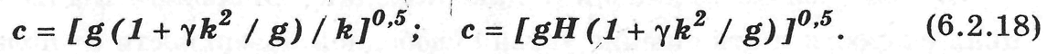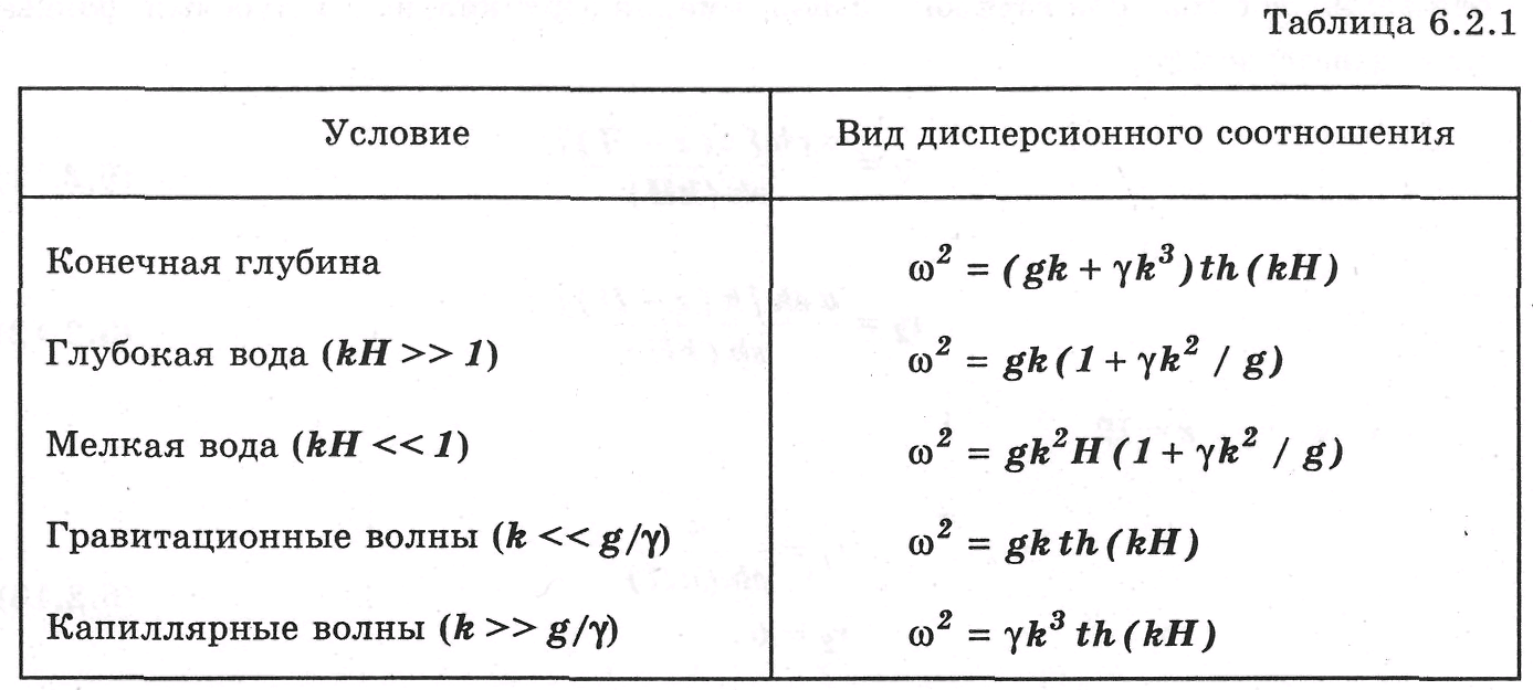 Частные случаи дисперсионного соотношения (6.2.16) приведены в таблице 6.2.1. (Где γ — коэффициент поверхностного натяжения, отнесенный к плотности воды.)