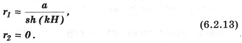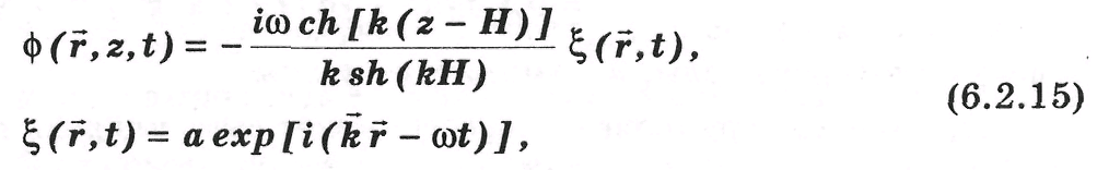 В общем случае в линейном приближении для ровного дна (H = const) потенциал скорости и отклонение уровня свободной поверхности от положения равновесия z = 0, как следует из решения (6.2.3) с граничными условиями (6.2.4), (6.2.5), равны соответственно: