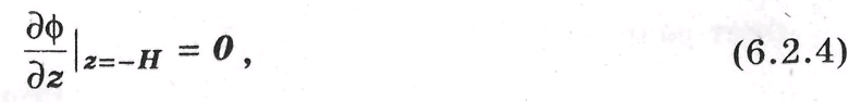 где z = -H — глубина моря, а также кинематическое граничное условие, определяющее связь между отклонением свободной поверхности от положения равновесия