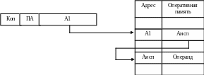 В адресном поле команды указывается адрес ячейки оперативной памяти, содержащей другой адрес, который может быть исполнительным Аисп или еще одним косвенным адресом (так называемая многоступенчатая косвенная адресация). Таким образом, косвенная адресация (рис. 6.3) может быть определена как «адресация адреса».
