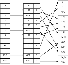 Каждой странице Рi (i=0, 1, 2, . . ., 2047) виртуальной памяти соответствует свой сегмент, адрес которого определен в таблице страниц, и, следовательно, каждому слову присвоен свой физический адрес.