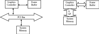 Если определить кратко, что такое AGP, то это - прямое соединение между графической подсистемой и системной памятью (рис.7.1, б). Это решение позволяет обеспечить значительно лучшие показатели передачи данных, чем при передаче через шину PCI, и явно разрабатывалось, чтобы удовлетворить требованиям вывода 3D графики в режиме реального времени. AGP позволит более эффективно использовать память страничного буфера (frame buffer), тем самым увеличивая производительность 2D графики также, как увеличивая скорость прохождения потока данных 3D графики через систему.