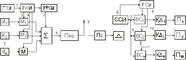 подается модулятор передатчика. Ритм работы всей системы обеспечивается генератором тактовых импульсов (ГТИ). В передатчике реализуется вторая ступень модуляции, в результате чего формируется радиосигнал. На приемной стороне этот радиосигнал демодулируется и на выходе демодулятора (Д) выделяется импульсный поток группового сигнала. Селектор синхроимпульсов (ССИ) выделяет из этого потока синхроимпульсы, которые обеспечивают
