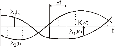 В многоканальных системах с временным разделением каналов (ВРК) канальные сигналы не перекрываются во времени, что обеспечивает их ортогональность. Рассмотрим один из способов формирования канальных сигналов в системе с ВРК. Сообщения λk, поступающие от источников, подвергаются дискретизации по времени так, чтобы отсчеты одного сообщения не совпадали с отсчетами другого (рис. 2.2.1,а). В соответствии с моментами отсчетов вырабатываются импульсы, параметры которых меняются в зависимости от значений сообщений сообщения в каждом отсчете. Рис. 2.2.1,б иллюстрирует систему, в которой пропорционально сообщению изменяется амплитуда импульсов. Канальные сигналы, образованные из сообщения λ1, не совпадают по времени с канальными сигналами, образованными из сообщения λ2.