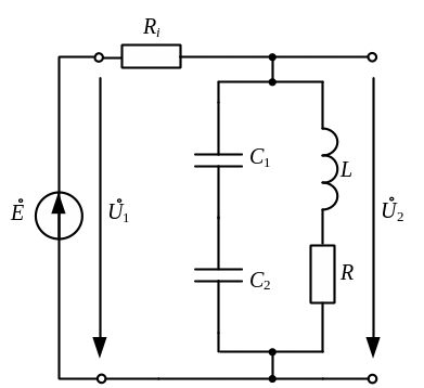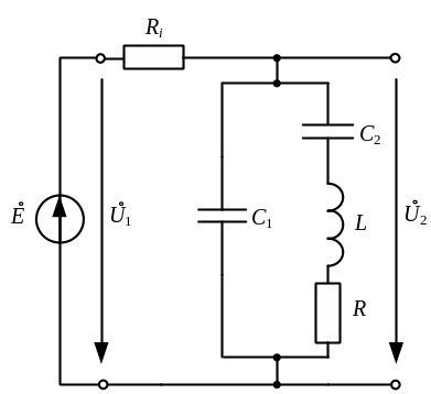 5. Рассчитайте частоту резонанса напряжений fрн сложного контура и вычислите модуль комплексного коэффициента передачи по напряжению на этой частоте K21( fрн ) для цепи, изображенной на рис. 2.9, б, если а) Ri = R1; б) Ri = R2.