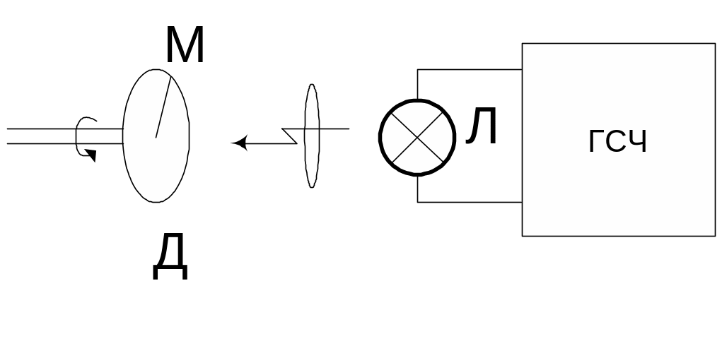 При совпадении частоты генератора f0 с частотой вращения диска Д радиальная метка М будет неподвижной.