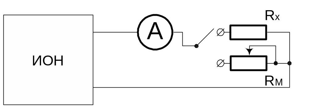 Измерения ведут до тех пор, (регулируя Rм) , пока показания А в обоих случаях будет одинаковым. Поскольку оба измерения производятся одним и тем же прибором в одинаковых условиях, погрешность результата измерения уменьшается в значительной мере.