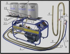 1 – насосная станция; 2 - смеситель; 5 - емкость с водой (показана условно, в комплекте отсутствует); 6 - заливочный трубопровод; 7 - питающие емкости; 8 – трубопровод подачи воздуха на смеситель; 9 – трубопровод подачи пены на смеситель; 10 - трубопровод подачи смолы на смеситель; 11 - шланг подачи компонента «А» в насос ПкМ-60; 12 - шланг подачи компонента «Б» в насос ПкМ70; 14 - кран 1/2 дюйма под шланг линии «А»; 15 - кран 1 дюйм под шланг линии «Б»; 19 – кран по линии «Б» на смесителе для вкладки фильеры; 20 – кран по линии пены на смесителе.
