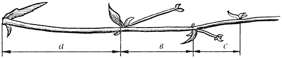 Возьмём утверждение: «Рассматривая расположение листьев на общем стебле растений, можно заметить, что между каждыми двумя парами листьев (А и С) третья расположена в месте золотого сечения (точка В)».