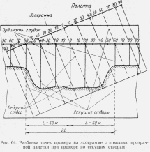 при промере с определением места точек с помощью секущих створов на планшет в соответствующем масштабе наносят линии секущих и ведущего створов. Затем изготавливают пропорциональную палетку из прозрачного материала (плексигласа или слегка промасленной кальки), на которую в масштабе планшета наносят линии тех же створов, а расстояние между ними L и 2L (рис. 64) делят на нужное количество интервалов и прокалывают точки. Через эти точки проводят семейство линий, параллельных линиям створов. Накладывают палетку на эхограмму и поворотом ее на нужный угол совмещают линии створов на палетке с точками на эхограмме, соответствующими этим линиям. Затем на эхограмме прокалывают точки пересечения нулевой линии с семейством прямых на палетке, обозначающих промежуточные точки промера. Опустив из найденных на нулевой линии точек перпендикуляры до пересечения их с линией дна, находят глубины, соответствующие этим точкам;