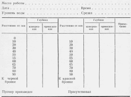 штаб для нанесения линии глубин принимают более крупным: 1 : 50 или 1 : 100; горизонтальный — 1 : 500, 1 : 1000 и Г : 2000. Чертеж оформляют названием его, указанием о привязке к условному горизонту, датой производства промера и подписями исполнителей и руководителя работ.