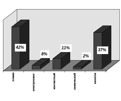 Как видно, основная часть обожженных, находившихся на лечении в специализированном стационаре (около 80 %) пострадали от ожогов пламенем и горячими жидкостями; ожоги пламенем у них превалируют (42 %). Обращает на себя внимание значительный удельный вес больных с электрическими ожогами (8 %), количество которых по нашим и литературным данным в прошлые годы составляло всего 2-3 % стационарных больных. В группе пострадавших от ожогов IV степени электрические повреждения даже выходят на первое место (около 39 %), несколько опережая по частоте ожоги пламенем (38 %) и контактные термические ожоги (19 %). Таким образом, основными этиологическими факторами, вызывающими ожоги IV степени, являются пламя, электрический ток и горячие или раскаленные предметы.